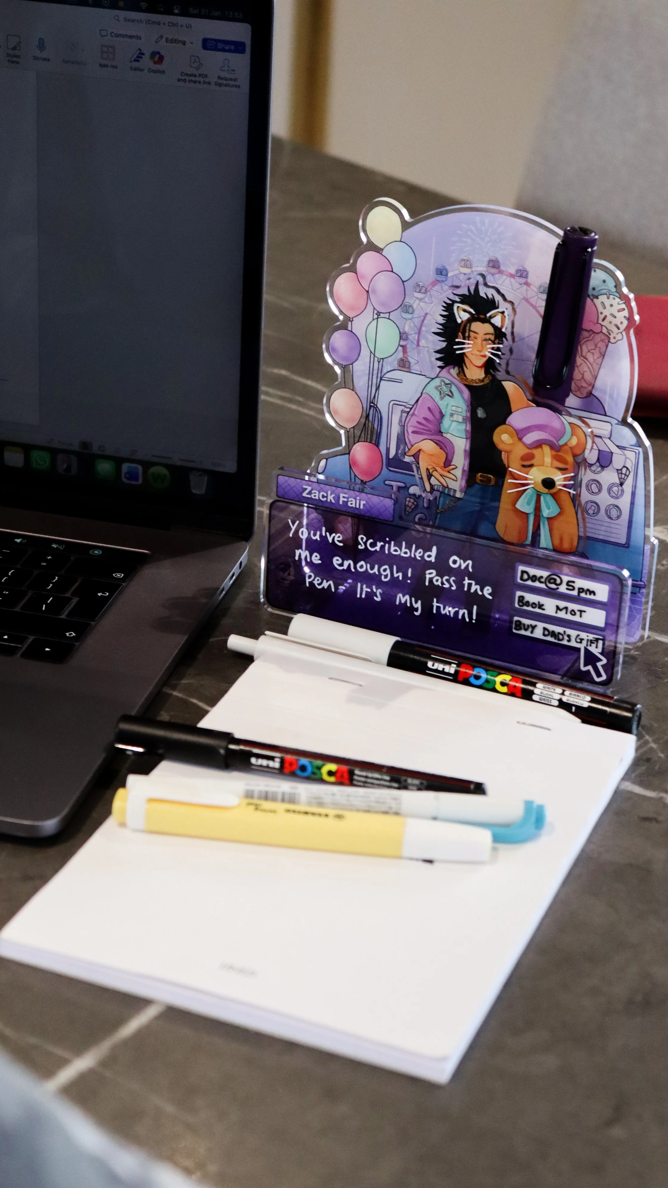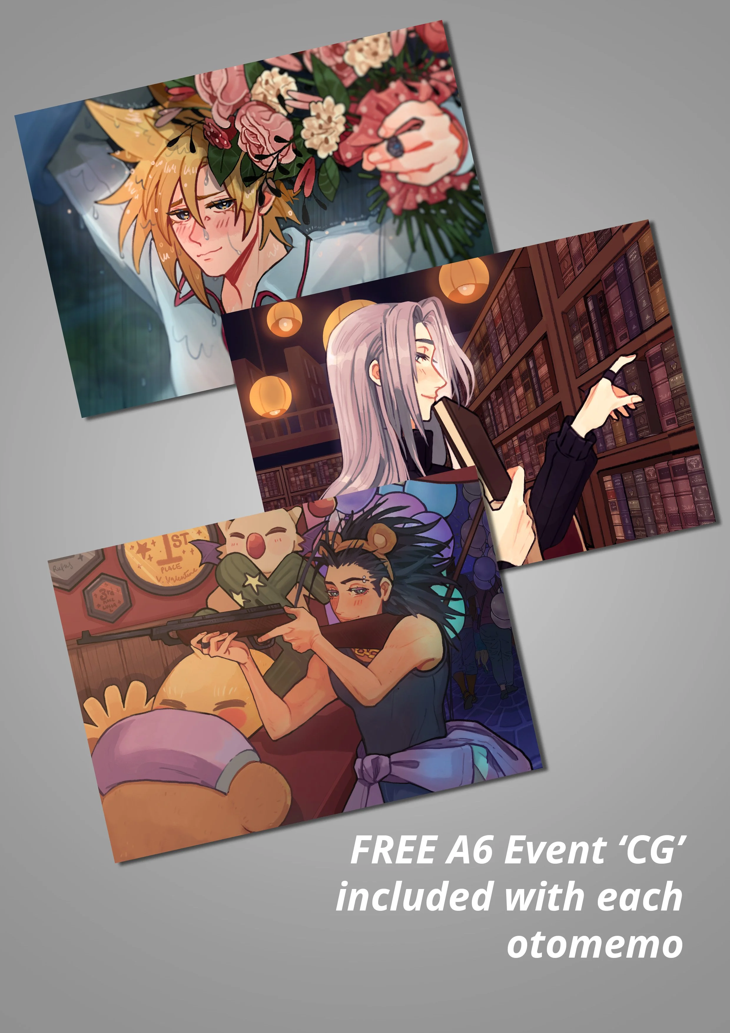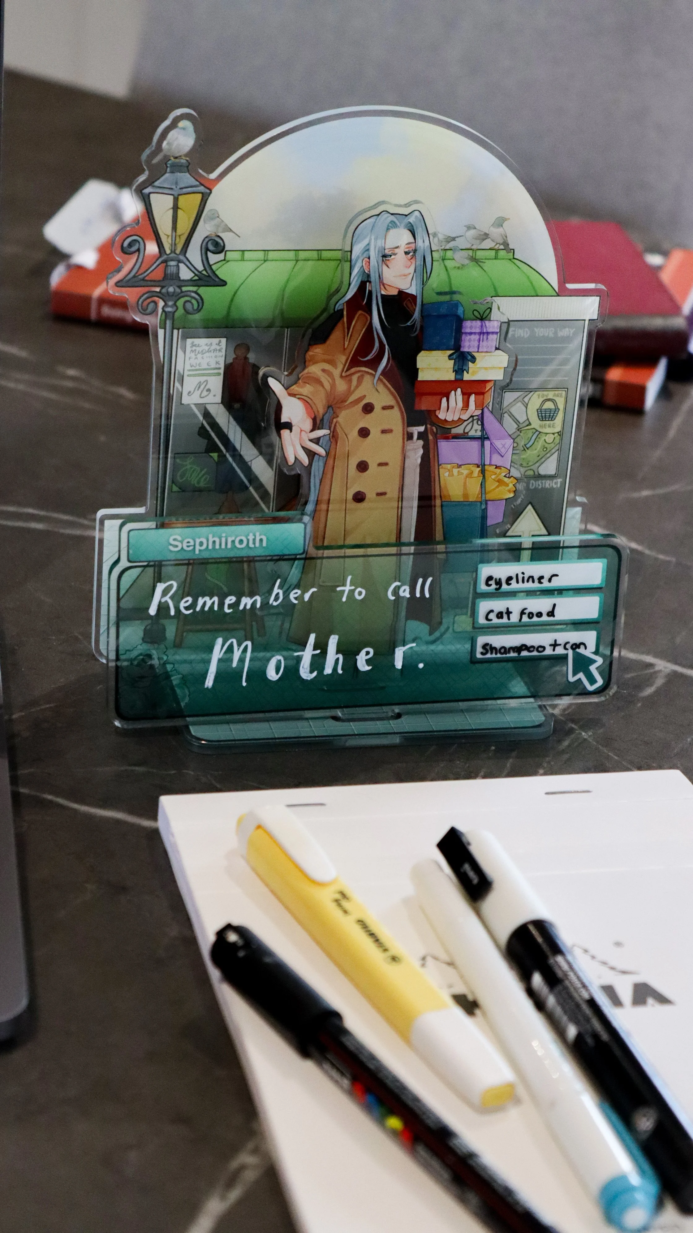 Inspired by ‘otome’ games and memo note-taking, this indulgent series is about placing characters Penguinsbite loves into otome contexts. Tell me you haven’t imagined your favourite character taking you on a date. You’re free to jot down quick notes or reminders on these visual novel styled standees.